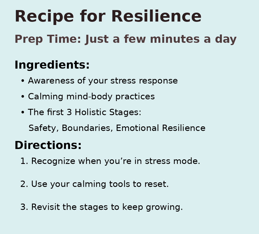 The Recipe for Resilience combines calming mind-body practices with the Holistic Stages of Development — a step-by-step framework for growth — to help you: